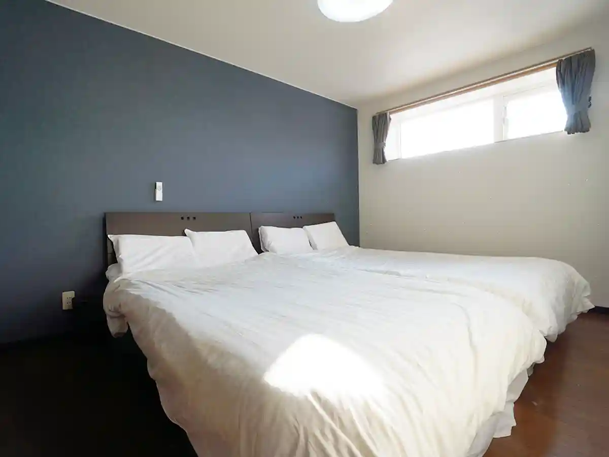 寝具はゆったりセミダブルベッド2台。 ソファベッドも完備しています。