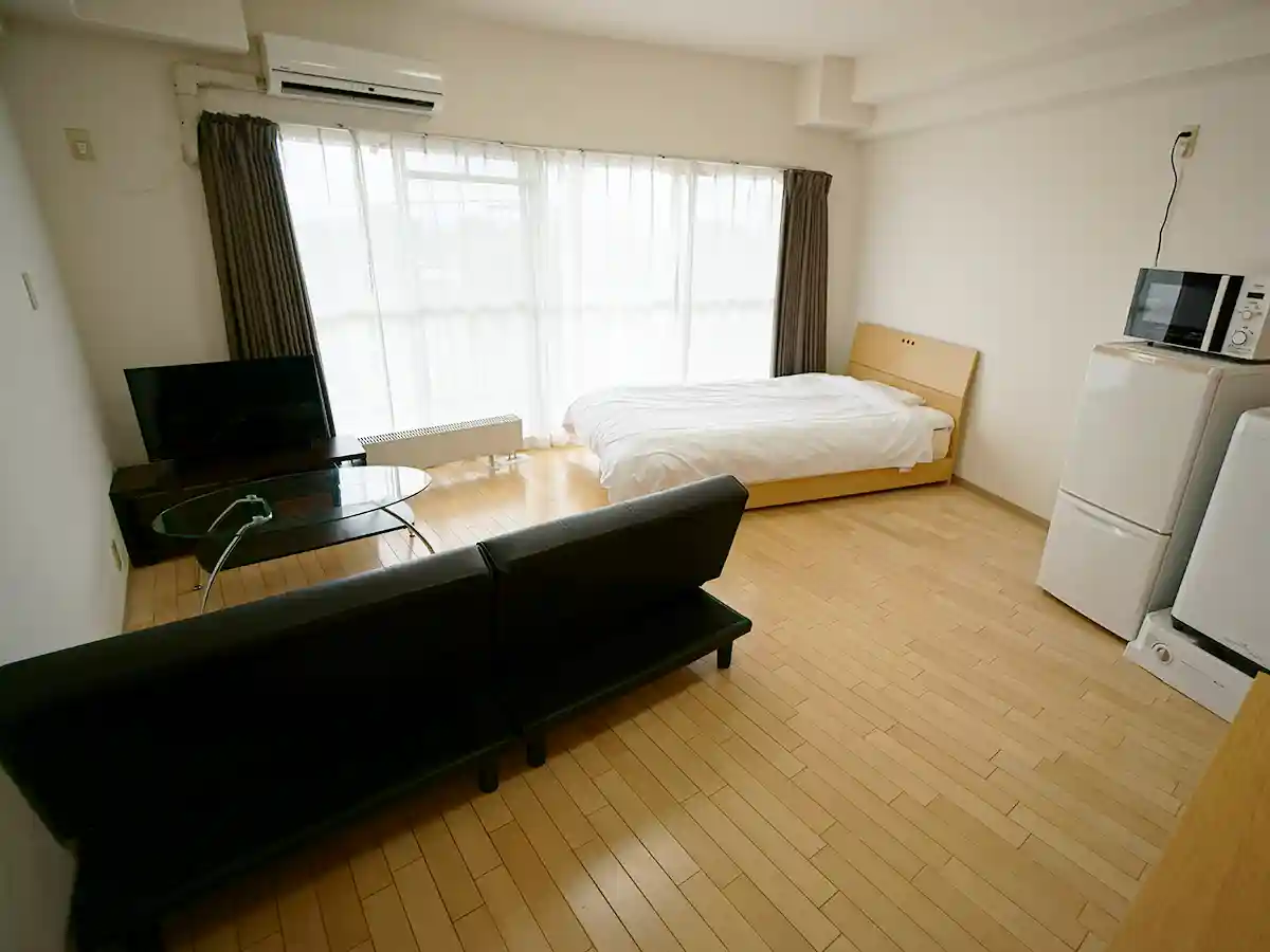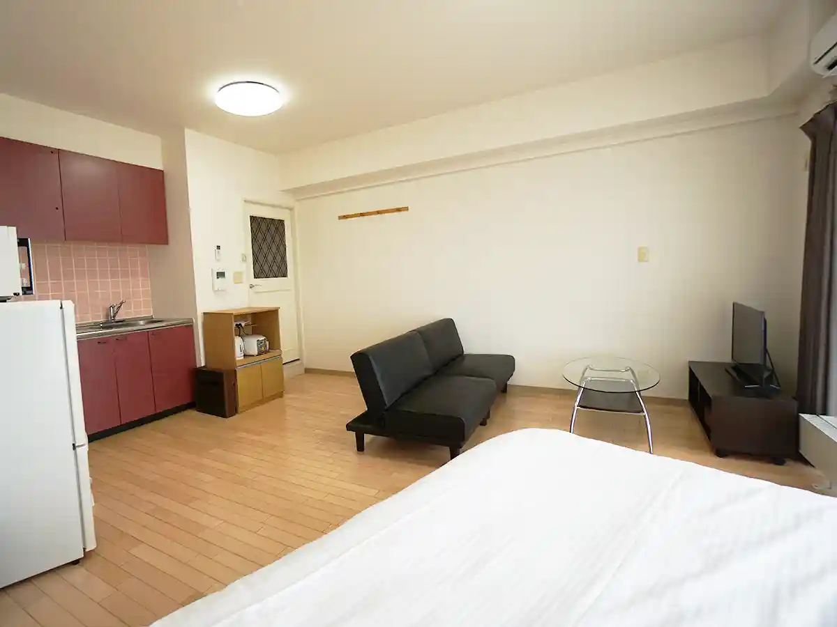徒歩約7分のところに無料駐車場あり、ソファベッドあり、2~3名入居可